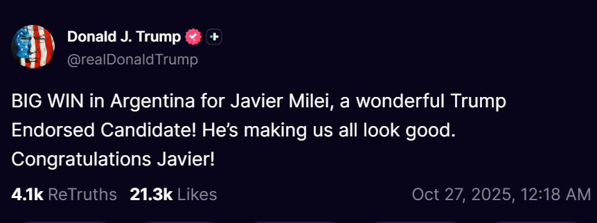 A választások után Trump elnök hétfőn a közösségi médiában ünnepelte a győzelmet, és így írt: „Nagy győzelem Argentínában Javier Milei számára, a csodálatos, Trump által támogatott jelöltnek! Mindannyiunkat jó színben tüntet fel. Gratulálunk, Javier!”