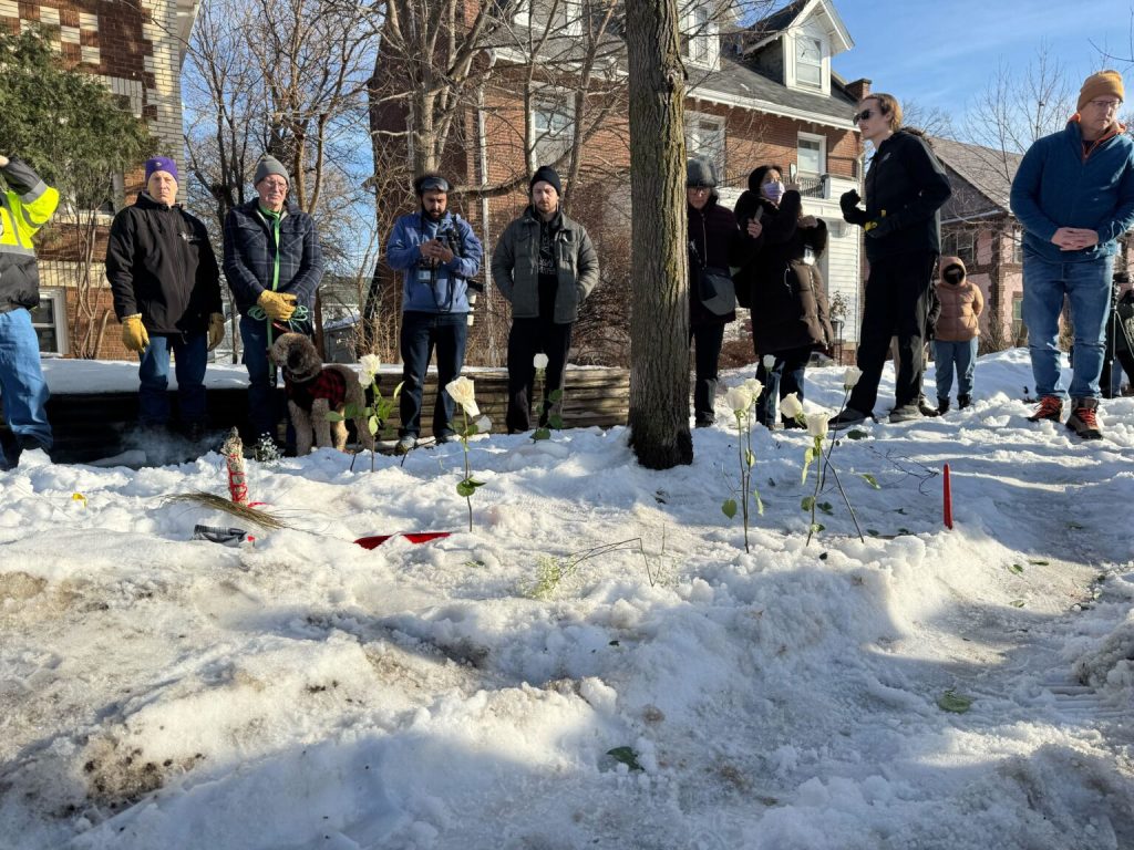 Az emberek fehér rózsákat helyeznek el azon a helyen, ahol 2026. január 7-én egy 37 éves nőt lelőtt és megölt egy ICE-tiszt Minneapolisban. (Fotó: Madison McVan/Minnesota Reformer)
