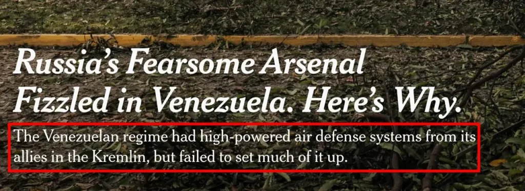 „Az amerikai tisztviselők szerint Venezuela fejlett, orosz gyártmányú légvédelmi rendszerei még radarhoz sem voltak csatlakoztatva, amikor az amerikai helikopterek lecsaptak Nicolás Maduro elnök elrablására, így a venezuelai légtér meglepően védtelen volt jóval azelőtt, hogy a Pentagon megindította támadását.”