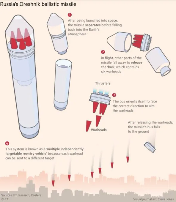 Az Oreshnik busz sokkal kifinomultabb irányító komponensekkel rendelkezik, mint pusztán „Gagarin giroszkópja”, ami lehetővé teszi számára, hogy a MIRV-vel felszerelt robbanófejeket több száz kilométerről pontosan a célpontra irányítsa, tekintve, hogy a busz a légkörben engedi ki őket, és a robbanófejek további hajtóerő nélkül „sodródnak” a célpont felé, vagy…