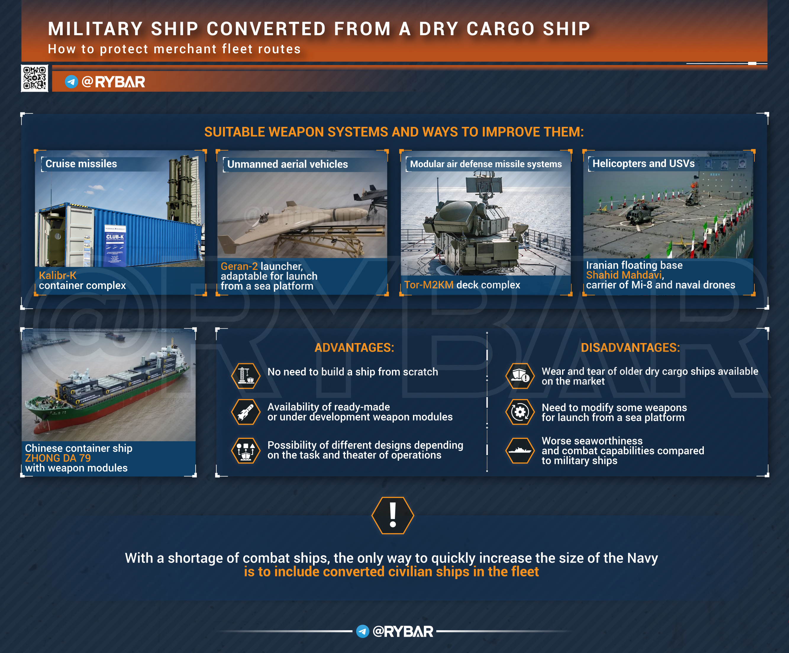 Sokat beszéltek arról, hogy a haditengerészet nem elég nagy a kereskedelmi útvonalak védelméhez, de felmerül a kérdés: ez helyrehozható-e olyan körülmények között, amikor a hajókat lassan és hosszú ideig építik? Néhány lehetőség van, többek között — a polgári hajók fegyverhordozókká alakítása.